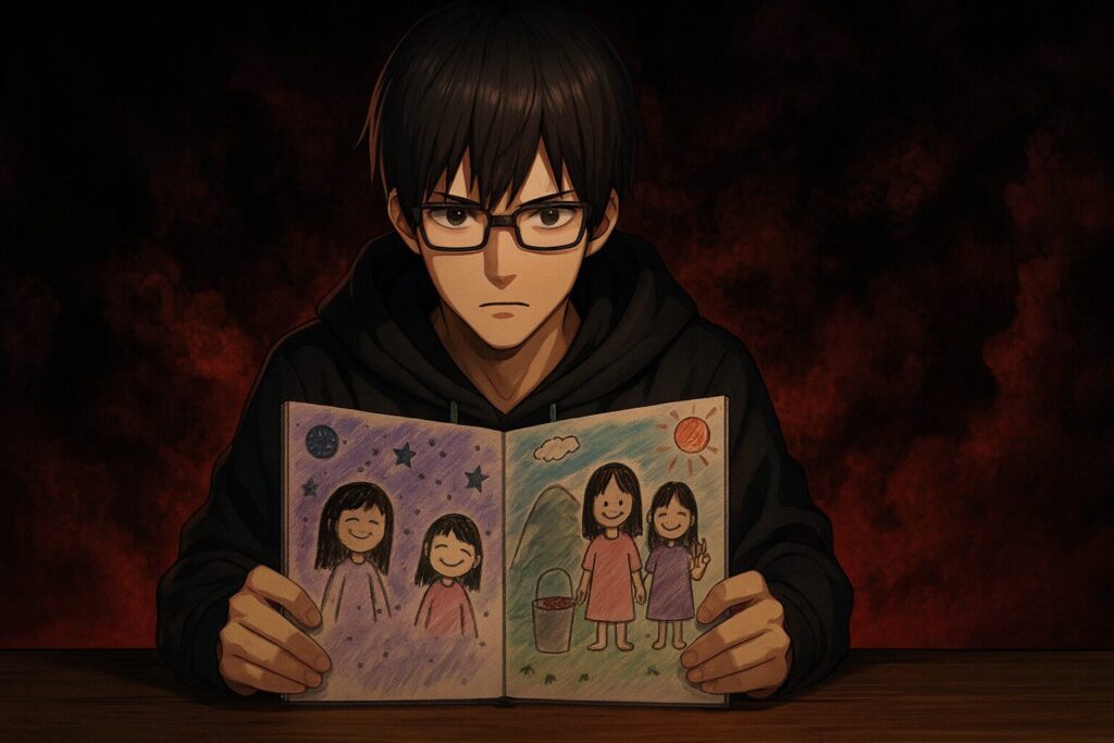 生活を始めて間もなく、彼は部屋の中で娘が遺したと思われる絵日記を発見します。最初は子供らしい無邪気な絵が続くものの、ページをめくるごとに、その内容は次第に不穏なものへと変わっていきます。この絵日記をきっかけとして、一家心中の裏に隠された衝撃の事実が少しずつ明らかになっていくのです。物語はネット掲示板のスレッド形式で進行し、読者もまたスレッドの参加者の一人になったかのような感覚で、謎解きに参加できる点が大きな魅力です。